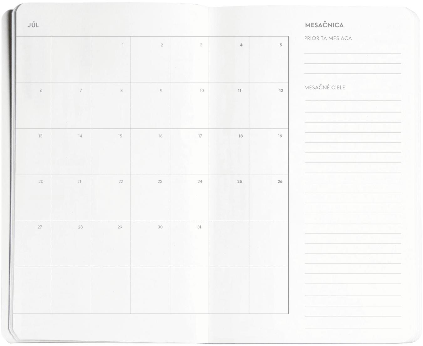 Každý nový mesiac je príležitosťou začať vedomejšie. V každej mesačnici si nastavíš jednu výzvu a popíšeš konkrétne kroky pre jej dosiahnutie. Nastav si priority tak, aby ti na konci mesiaca zostali nielen splnené tudúčka, ale aj pokoj vo vnútri.